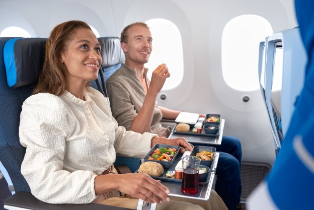 The new seats in Premium Comfort Class were designed by Collins Aerospace together with specialists at KLM Customer Experience. Apart from their elegant design and comfort features, the seats are also lighter than previous designs. Similar care was taken in selecting catering materials for Premium Comfort. They are either reusable (special cutlery, bowls and plates made of lightweight polypropylene) and those that are not reusable are made of recycled PEF. All materials were carefully assessed in terms of circularity and weight, without detracting from aesthetic features.