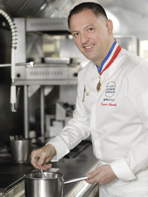 François Adamski trained in the kitchens of the Hôtel de Matignon, then at the Plaza Athénée, the Ritz, the Maison Prunier and the Hôtel Intercontinental. In 2001, François Adamski won the Bocuse d'Or, and in 2007 became Meilleur Ouvrier de France. After six years working at the Abbaye Saint-Ambroix in Bourges, where he maintained the first Michelin star obtained by his predecessor, he headed west in 2009 to Bordeaux. He took over the management of Gabriel's kitchens, in a private hotel, Place de la Bourse. Thanks to his perfect mastery of the great French classics, he was awarded his first Michelin star. In 2012, his sense of commitment to the profession and his desire to pass on his knowledge led him to become president of Team France Bocuse d'Or until 2020. In 2021, he was appointed vice-president of the Toques Françaises. At the beginning of 2019, François Adamski set himself a new challenge by joining Servair, the leading French airline catering company, as Corporate Chef. His mission was to promote the company's culinary identity and encourage the sharing of know-how. He also holds the position of Secretary General of the Servair Culinary Studio, a creative laboratory made up of starred chefs and culinary experts, and in this capacity is in charge of the company's culinary innovations.