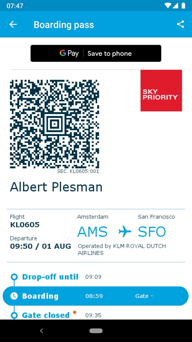 KLM is one of the first airlines in Europe that offers the functionality to store the boarding pass to the Google Pay app. Boarding passes automatically pop up on a phone a couple of hours before the flight. A similar functionality was already available to users of the iOS KLM app, via Apple Wallet.