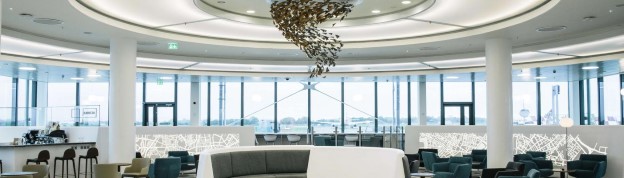 The 8,000-square-foot facility, which opened this week, holds 180 people and has a large hot and cold food and beverage offering, themed to showcase Irish food with an American twist. The lounge is located after the U.S. Customs and Border Protection pre-clearance facility in Terminal 2 and is the closest lounge to an active runway, the first of its kind in the world.